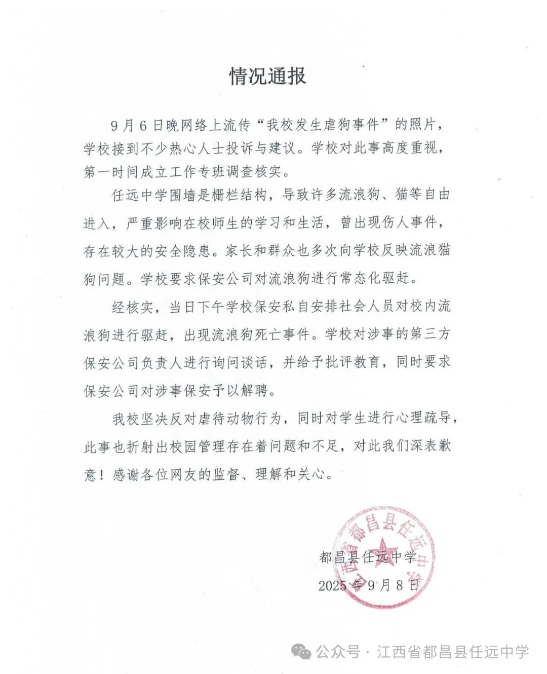 中新网9月8日电 据江西省都昌县任远中学微信公众号消息,江西省都昌县任远中学发布情况通报表示,9月6日晚网络上流传“我校发生虐狗事件”的照片,学校接到不少热心人士投诉与建议。学校对此事高度重视,第一时间成立工作专班调查核实。