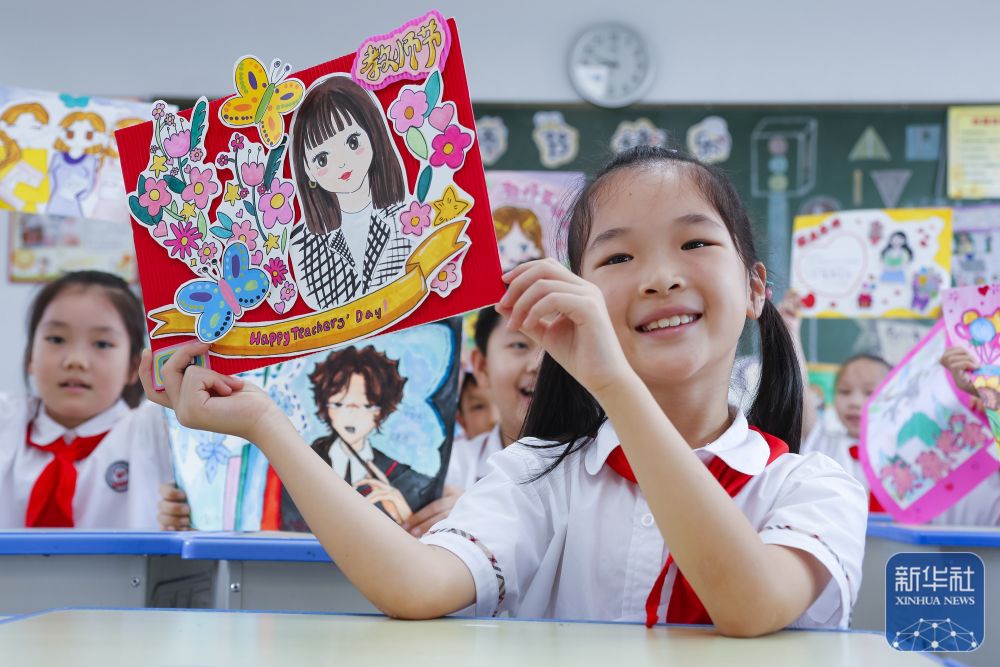 9月9日,在江苏省句容市实验小学,学生展示手工制作的教师节贺卡。新华社发(钟学满摄)
