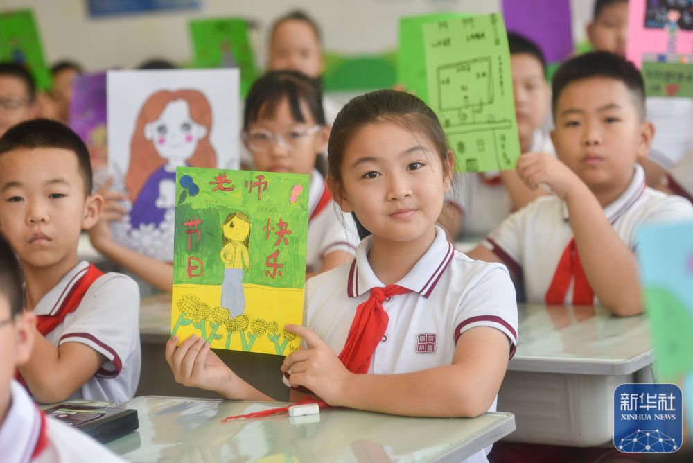 9月9日,在山东省青州市宏远学校,学生展示为老师绘制的肖像画。新华社发(王继林摄)