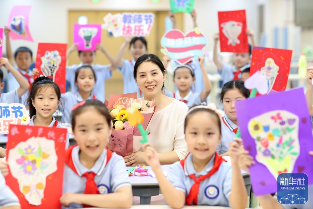 9月9日,在江苏省泰州市姜堰区实验小学教育集团北街北校区,学生手持手工制作的教师节贺卡和老师合影留念。新华社发(周社根摄)