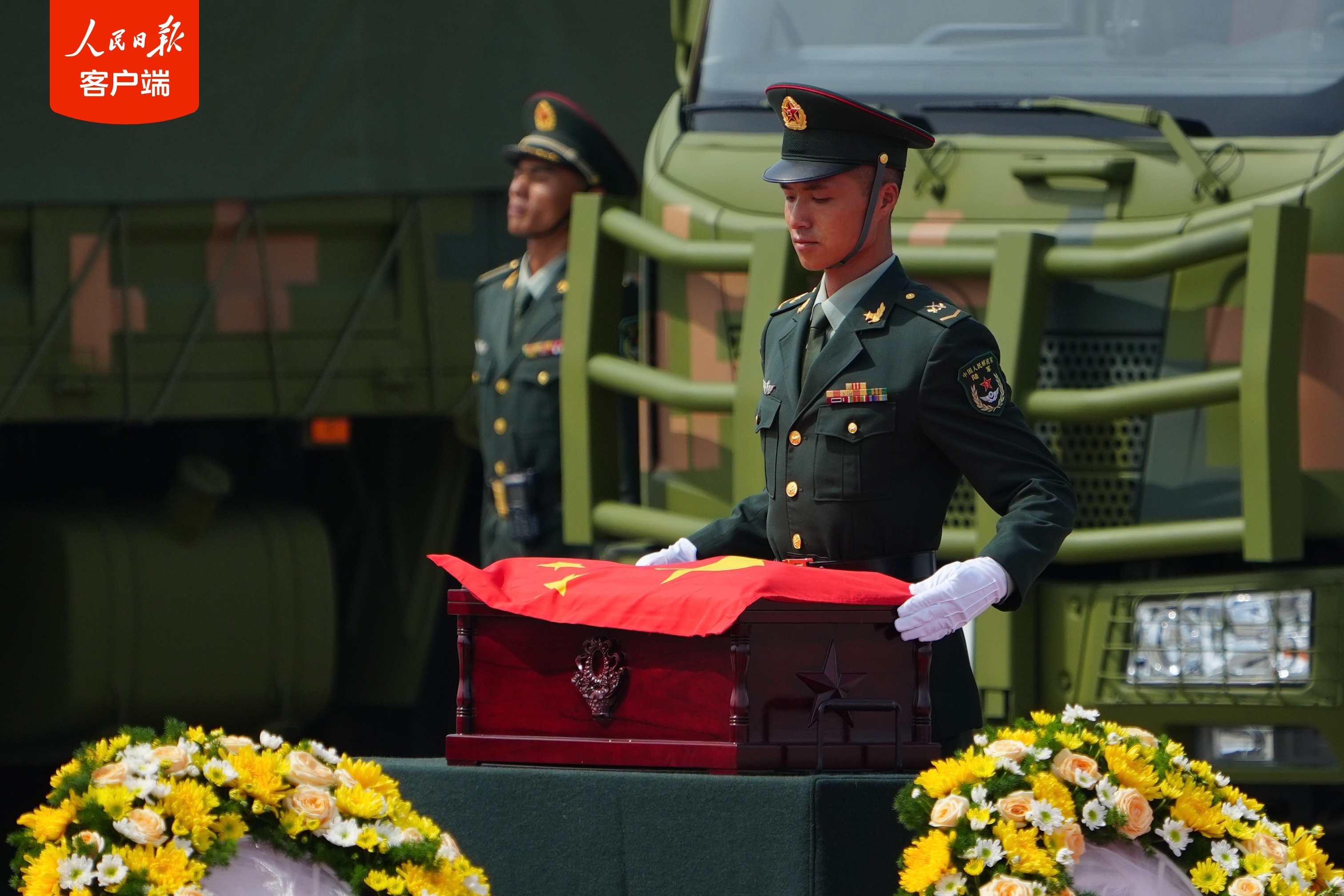 细节一:志愿军烈士遗骸棺椁覆盖国旗