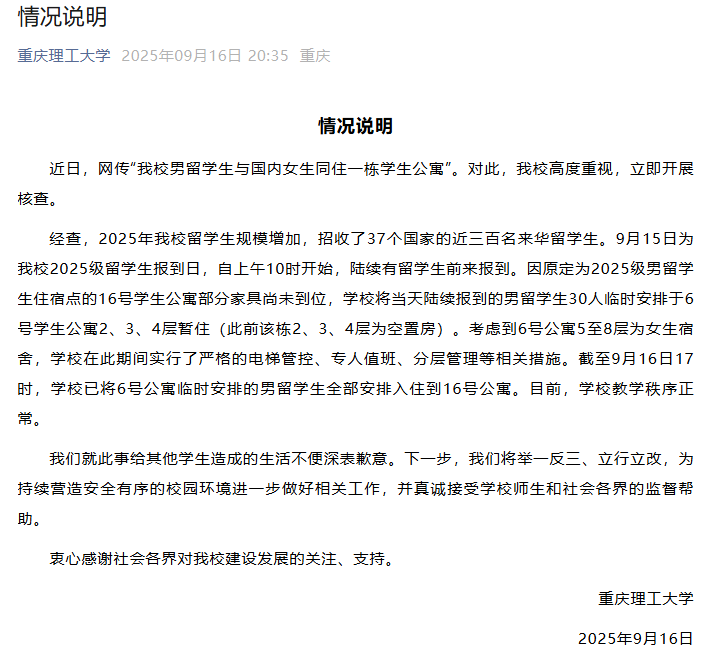 中国网9月16日讯 9月16日晚间,重庆理工大学就此前网传“男留学生与国内女生同住一栋学生公寓”发布情况说明。内容如下: