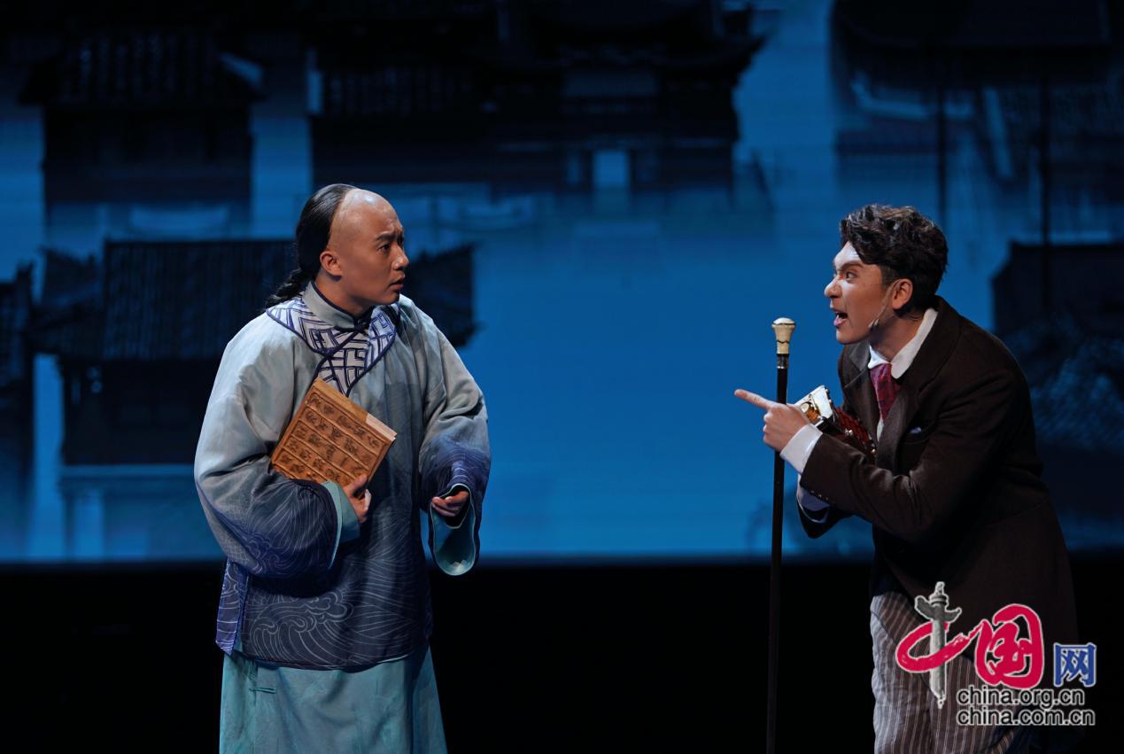 《北上》“周年版”更聚焦谢、孙、邵三家后人在同一实存空间的交汇点,百年家族血脉与运河文脉的“同频共振”愈发清晰。同时,多媒体影像与榫卯结构船只的动态组合,让更多运河地标“活”在舞台上,观众仿佛置身千年水道;搭配灯光设计,也使其剧中人物的情感进一步得到深化,意大利人小波罗与翻译谢平遥的百年追寻,与当代后人“沿着运河找自己”的旅程构成一种拉康式的镜像关系,家国情怀在“河运、国运、人运”的史诗中层层递进。