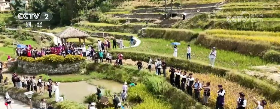 眼下,在云南省红河州红河县,稻谷在田垄间渐次泛黄,游客与村民齐聚稻浪间,共享丰收喜悦。
