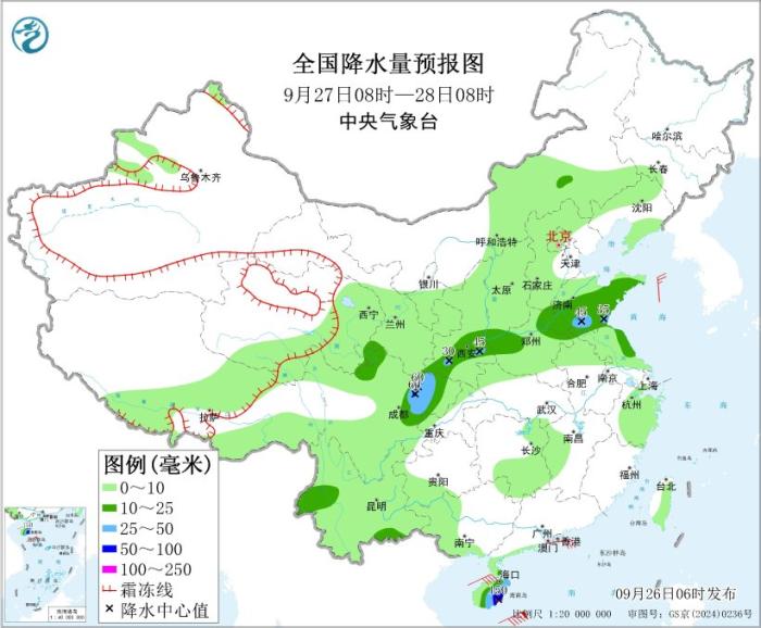 9月27日08时至28日08时,陕西中南部、河南西部和东北部、山东大部、江苏东部、四川东北部、云南西部、海南岛等地部分地区有中到大雨,其中,四川盆地西北部、海南岛东南部等地部分地区有暴雨,局地有大暴雨(100~150毫米);南海中部海域有9~11级、阵风12级的大风。
