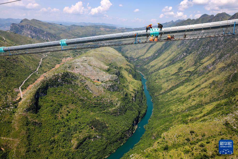2024年9月4日,工人在贵州花江峡谷大桥的猫道上施工。