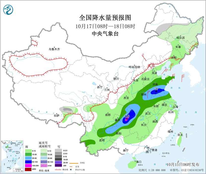 10月17日08时至18日08时,东北地区中北部、内蒙古东北部、西藏东北部等地的部分地区有小到中雪或雨夹雪;华北南部、黄淮、江淮北部、湖北、重庆、贵州中北部、湖南西北部、云南东北部和西南部等地部分地区有中到大雨,其中,山东南部、河南东部、安徽北部、江苏北部、湖北西南部、湖南西北部、重庆东部、贵州东北部等地部分地区有暴雨或大暴雨(100~110毫米)。内蒙古中东部、华北北部和东部、黄淮、江淮等地部分地区有4~6级风(见图3)。