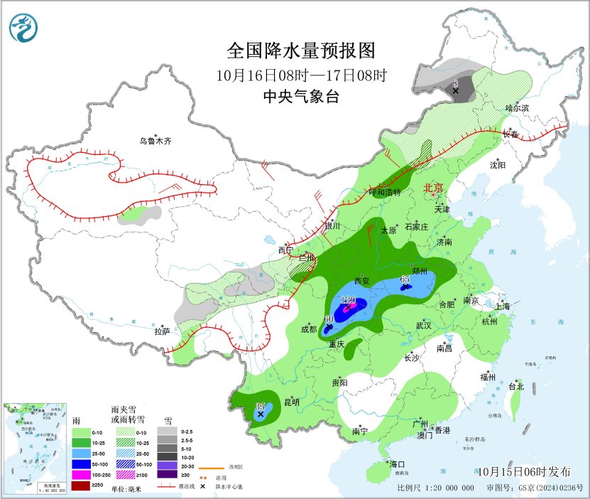 图1 全国降水量预报图(10月15日08时-16日08时)