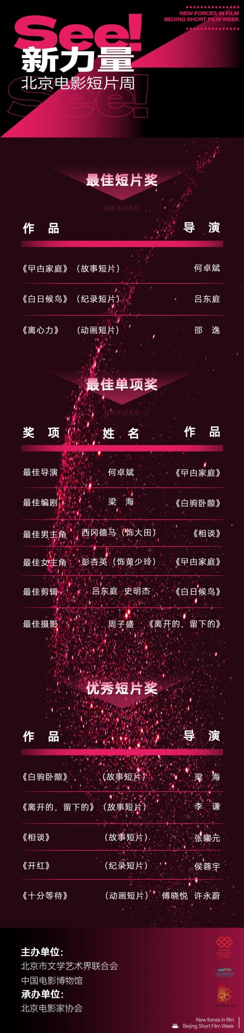 据悉,10月21日-22日,北京市文联老舍剧场将进行“See·新力量”北京电影短片周佳作展映活动。
