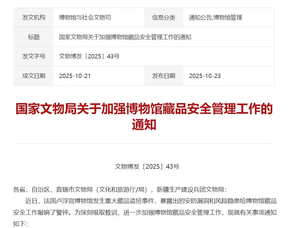 中国网10月24日讯 据国家文物局网站消息,针对近日法国卢浮宫博物馆发生重大藏品盗抢事件,10月23日,国家文物局网站发布《国家文物局关于加强博物馆藏品安全管理工作的通知》(以下简称《通知》)。《通知》强调,在观众流量高峰时段,各博物馆要增加巡逻频次,重点关注展柜周边异常行为,及时制止观众的不安全行为。