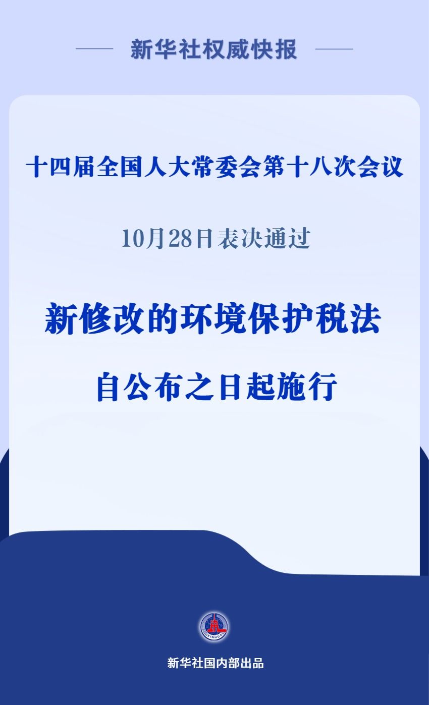 十四届全国人大常委会第十八次会议10月28日表决通过关于修改环境保护税法的决定,并自公布之日起施行。