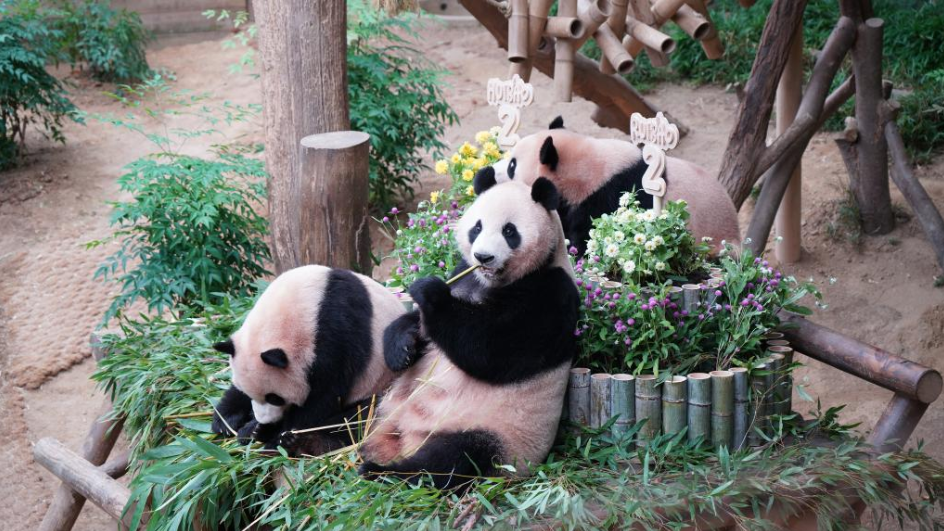 2025年7月7日,在韩国京畿道龙仁市爱宝乐园,大熊猫妈妈“爱宝”(中)和“睿宝”、“辉宝”在庆生活动上享用美食。新华社发(孙一然摄)