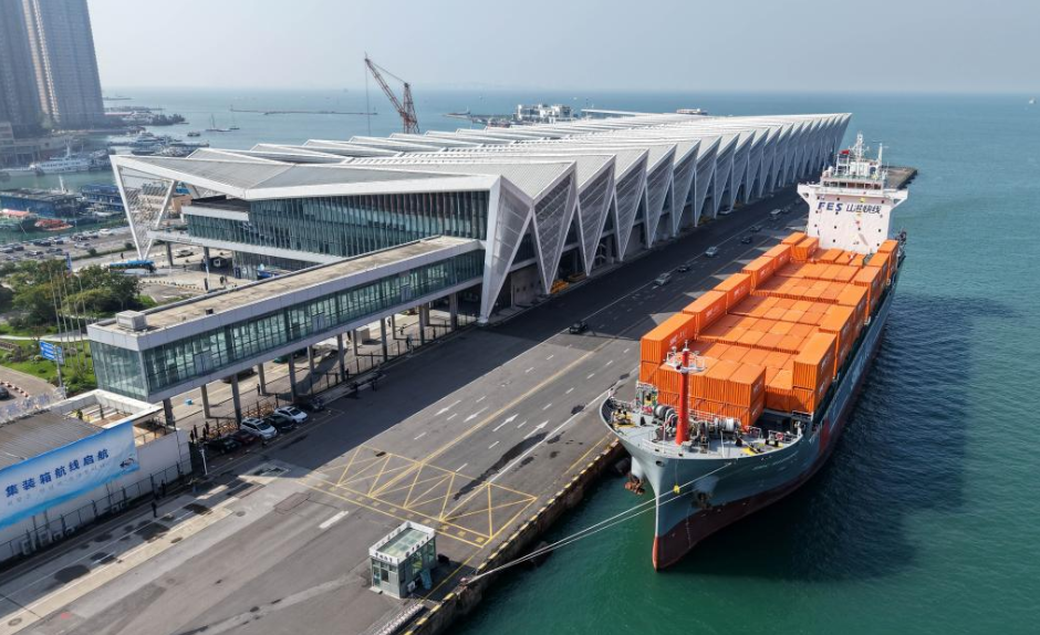 2025年10月16日,执行“青岛—济州”首航航次的“SMC RIZHAO”轮靠泊在青岛邮轮母港码头(无人机照片)。新华社记者 李紫恒 摄