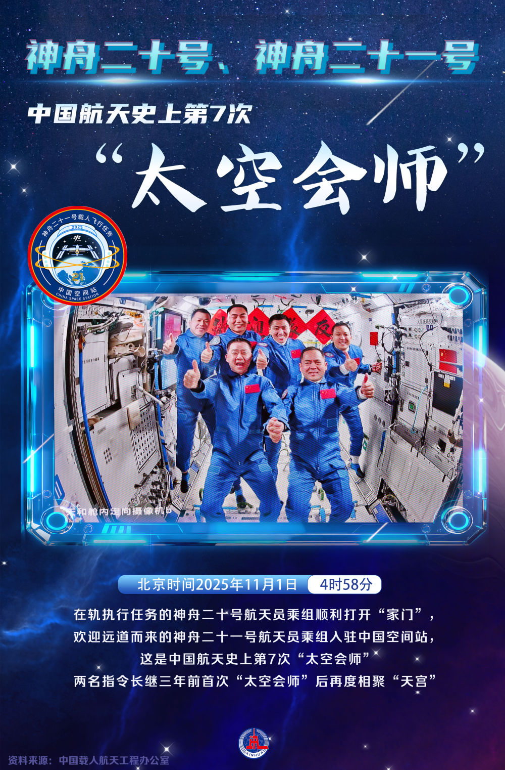 北京时间2025年11月1日4时58分,在轨执行任务的神舟二十号航天员乘组顺利打开“家门”,欢迎远道而来的神舟二十一号航天员乘组入驻中国空间站,这是中国航天史上第7次“太空会师”。两名指令长继三年前首次“太空会师”后再度相聚“天宫”。随后,两个航天员乘组拍下“全家福”,共同向牵挂他们的全国人民报平安。