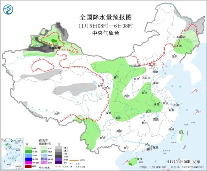 11月5日8时至6日8时,新疆北部、东北地区东部、青海中部等地部分地区有小到中雪或雨夹雪,其中,新疆阿勒泰、沿天山一带等地部分地区有大到暴雪(10~15毫米),新增积雪深度6~10厘米,部分地区15~20厘米。内蒙古西部、西北地区东部、黄淮西部、江淮西部、江汉、西南地区东北部和西南部、海南岛等地部分地区有小雨,局地有中雨。南海东南部海域将有10~12级、阵风13级的风,南海西南部海域将有10~11级、阵风12级的风,南海中部海域将有6~8级、阵风9级的风。