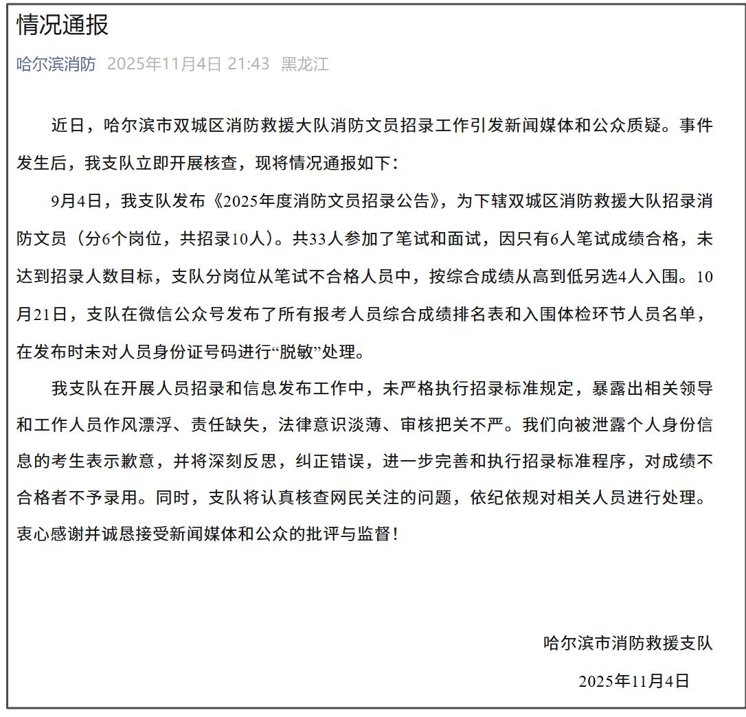 暴露考生信息,哈尔滨市消防救援支队发布情况通报