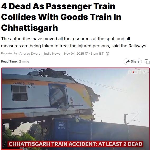 中新网11月4日电 据印度新德里电视台(NDTV)报道,当地时间11月4日,印度中部恰蒂斯加尔邦发生火车相撞事故,一列客运列车和一列停靠的货运列车相撞,事故已造成4人死亡。
