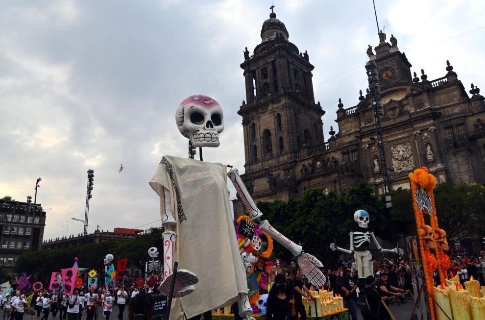 11月1日,在墨西哥首都墨西哥城,演员参加亡灵节游行。新华社记者章磊摄