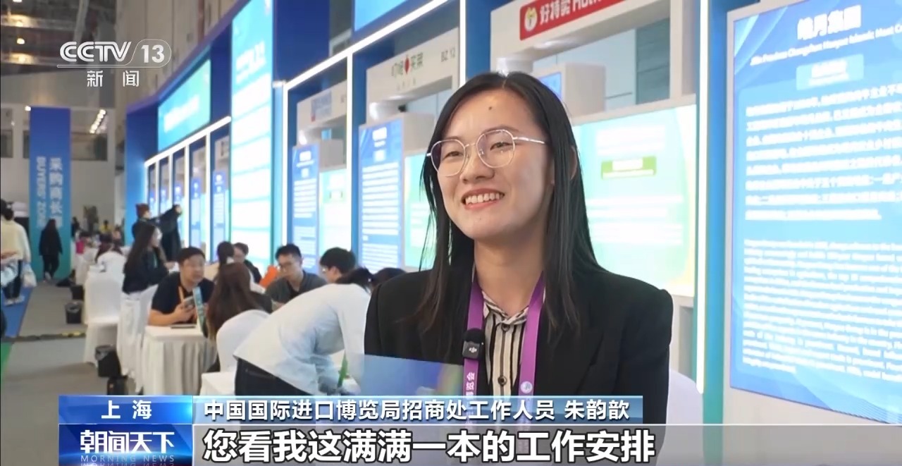 中国国际进口博览局招商处工作人员 朱韵歆:累并快乐着,看到展客商朋友们都有很大的收获,我们中国老百姓也能够享受到更加优质的产品,能够参与其中,这一点其实让我非常高兴,非常自豪。