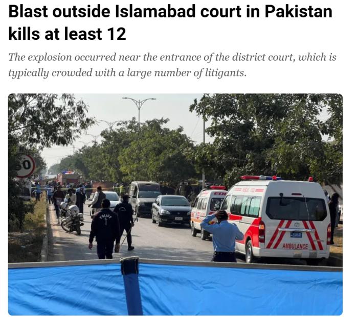 中新网11月11日电 据卡塔尔半岛电视台报道,巴基斯坦首都伊斯兰堡警方称,当地时间11日,伊斯兰堡一座法院大楼外发生爆炸,造成至少12人死亡,多人受伤。