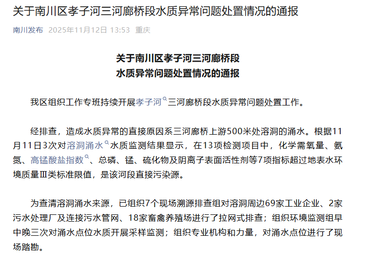 中国网11月12日讯 据“南川发布”微信公号消息,重庆市南川区人民政府12日发布关于南川区孝子河三河廊桥段水质异常问题处置情况的通报。全文如下: