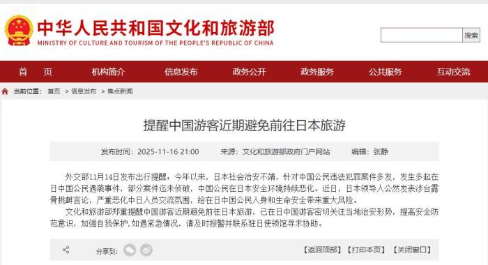 据文旅部网站消息,外交部11月14日发布出行提醒:今年以来,日本社会治安不靖,针对中国公民违法犯罪案件多发,发生多起在日中国公民遇袭事件,部分案件迄未侦破,中国公民在日本安全环境持续恶化。近日,日本领导人公然发表涉台露骨挑衅言论,严重恶化中日人员交流氛围,给在日中国公民人身和生命安全带来重大风险。