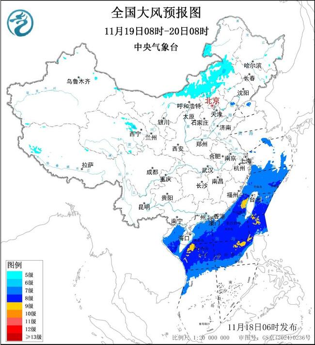 11月19日08时至20日08时,内蒙古东北部、河北北部等地部分地区有5~6级风,阵风7级;东海南部海域、台湾海峡、台湾以东洋面、巴士海峡、南海北部和中部海域、北部湾将有7~8级、阵风9~10级的大风,其中台湾海峡、台湾以东洋面、巴士海峡、南海东北部和中西部的部分海域风力可达9级、阵风10~11级。