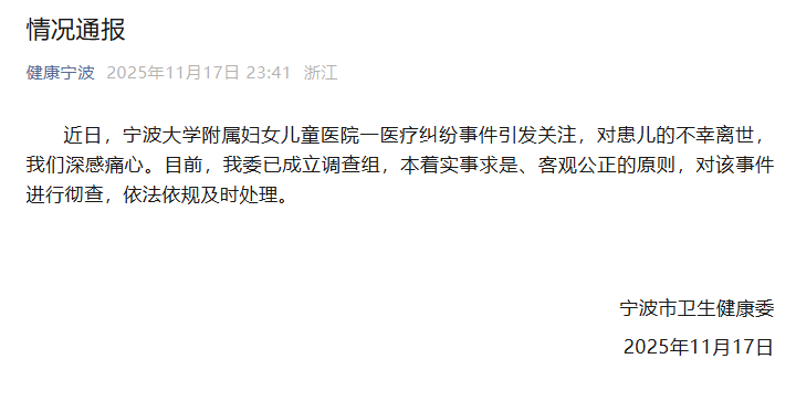 中国网11月18日讯 据“健康宁波”微信公众号消息,11月17日深夜,宁波市卫生健康委发布情况通报称,近日,宁波大学附属妇女儿童医院一医疗纠纷事件引发关注,对患儿的不幸离世,我们深感痛心。目前,我委已成立调查组,本着实事求是、客观公正的原则,对该事件进行彻查,依法依规及时处理。