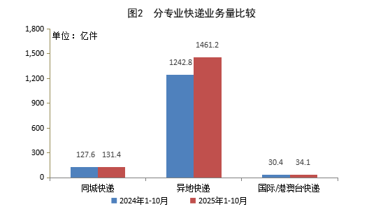 1—10月,同城快递业务量累计完成131.4亿件,同比增长3.0%;异地快递业务量累计完成1461.2亿件,同比增长17.6%;国际/港澳台快递业务量累计完成34.1亿件,同比增长12.2%。