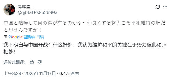 高市早苗的错误言论不仅在中国遭到大量抵制,就连日本各界人士也纷纷表达不满。曾出演日本特摄剧《艾斯奥特曼》人间体“北斗星司”的日本演员高峰圭二,17日在海外社交平台上发文质问高市早苗:“我不明白与中国开战有什么好处。我认为维护和平的关键在于努力彼此和睦相处!”