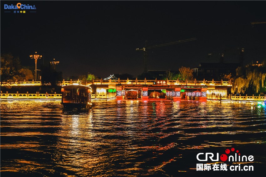 晚上的汴河两岸,光影交织,桨声四起。采风团乘船游览,看古城夜景与国潮演绎完美融合,不禁连连称奇。