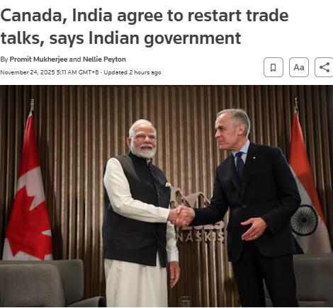 中新网11月24日电 据路透社报道,当地时间11月23日,印度政府表示,加拿大和印度已同意重启陷入停滞的新贸易协定谈判。此前,两国因外交争端而暂停了相关讨论。