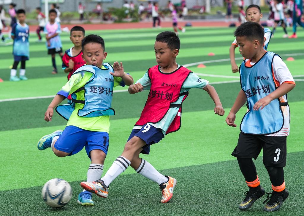 4月25日,在贵州省榕江县古州镇第六小学,学生们在“班超”足球赛中拼抢。新华社发(王炳真 摄)