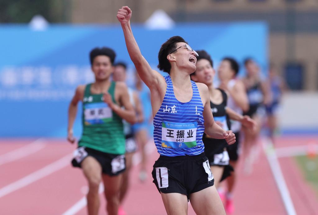2023年11月13日,山东选手王振业在第一届全国学生(青年)运动会田径项目中学组男子1500米决赛中冲过终点。新华社记者 吴梓溢 摄