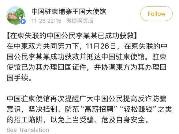 中国网11月27日讯 据中国驻柬埔寨大使馆微博消息,在中柬双方共同努力下,11月26日,在柬失联的中国公民李某某成功获救并抵达中国驻柬使馆。驻柬使馆已为其办理回国证件,并协调柬方为其办理回国手续。