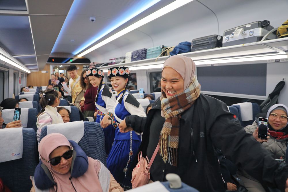 11月22日,在丽香铁路动车组列车上,东南亚游客与身着民族服饰的乘务员一同跳舞。新华社发(杨紫轩摄)