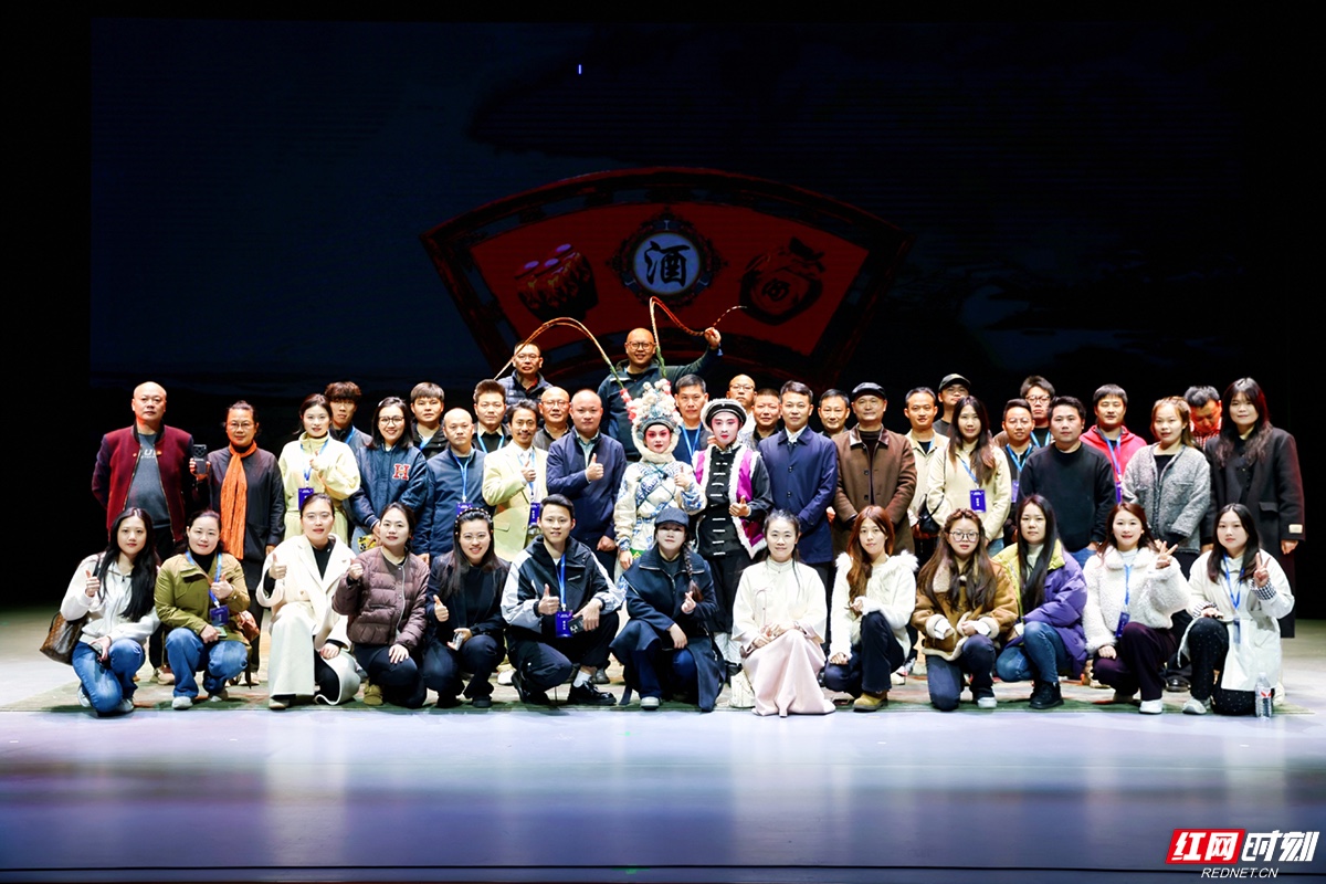 采访活动最后,所有人在舞台中央合影。演员站在中间,采风团成员围在四周,大家不约而同地竖起大拇指。