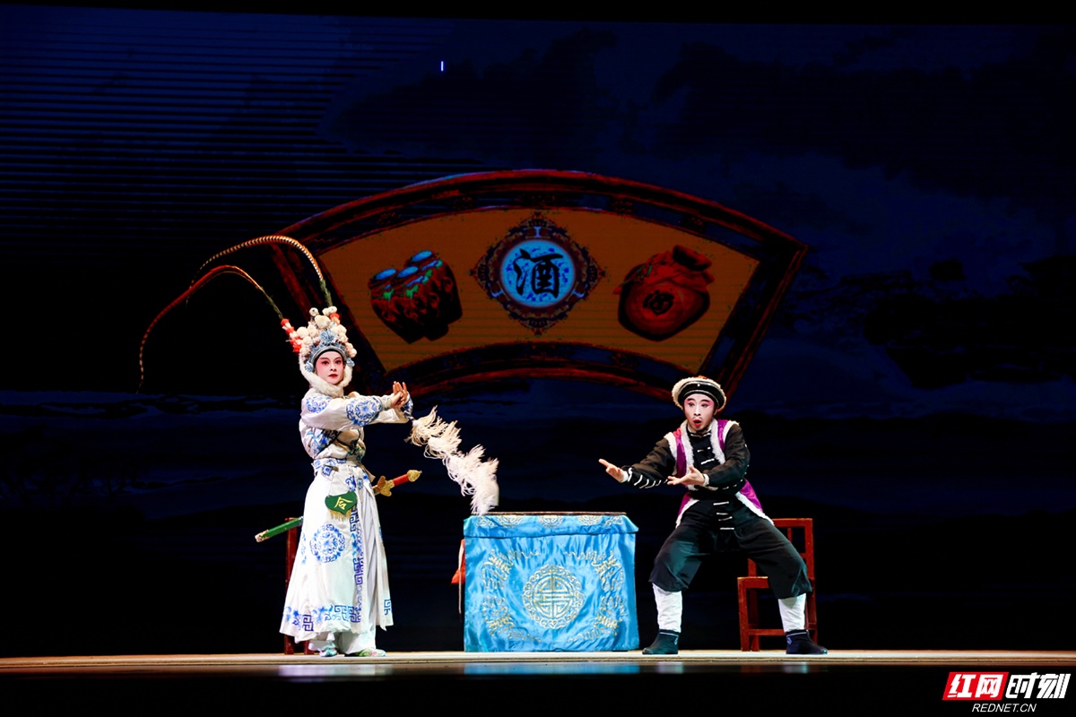 台上,湘剧折子戏《拦马》正演到酣处。杨八姐与焦光普在方桌之间腾挪跳跃,高难度的“盗牌”舞蹈与椅子功引得台下掌声不断。