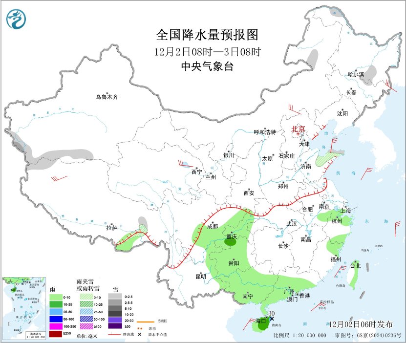 图4 全国降水量预报图(12月2日08时-3日08时)