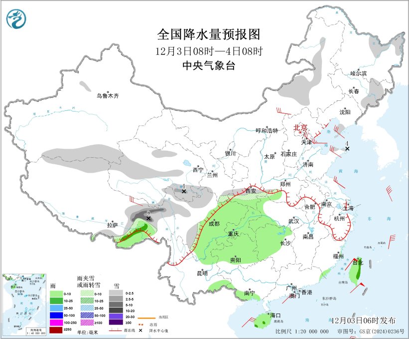 图3 全国降水量预报图(12月3日08时-4日08时)