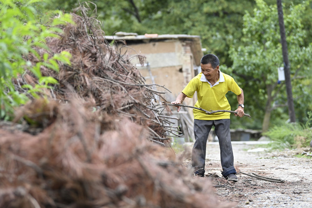 ↑秦海松为村民元有才整理柴火(2025年8月6日摄)。