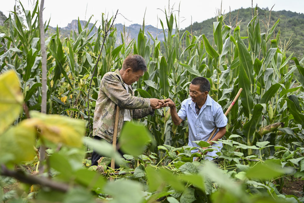 ↑村民桑建平(左)通过手势告诉秦海松野草和蔬菜的区别(2025年8月27日摄)。