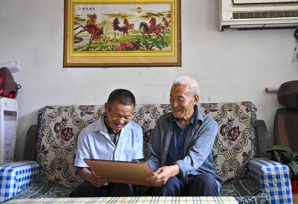 ↑桑春玉(右)向秦海松展示家里的老照片(2025年8月27日摄)。