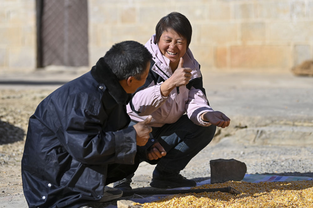 ↑村民程娇梅(右)向帮忙捡玉米的秦海松表达感谢(2025年12月1日摄)。
