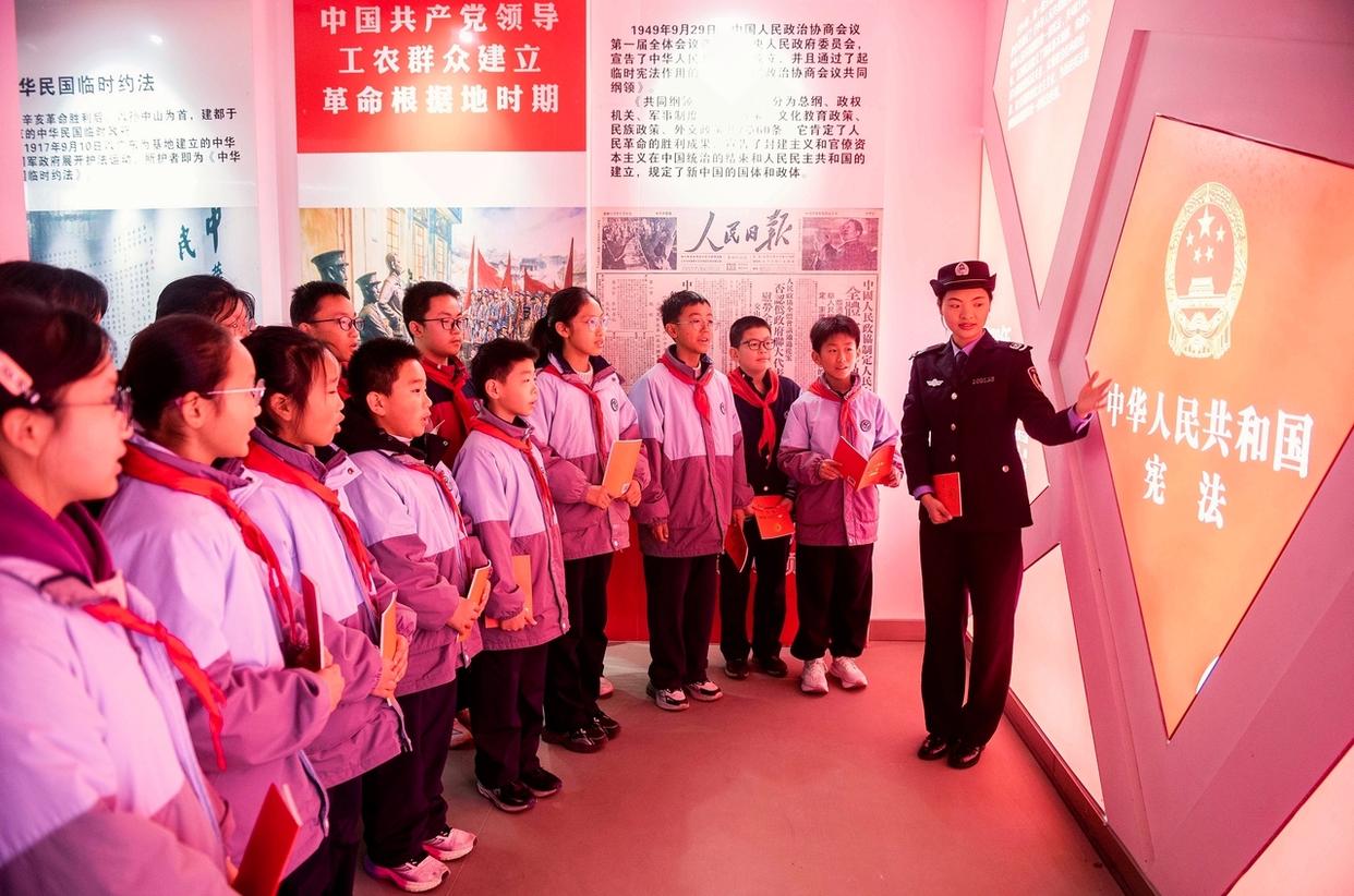 12月4日,民警在江苏省泰州市海陵区九龙实验学校给学生讲解宪法知识。当地,通过咨询、普法课堂等多种形式开展宪法宣传教育活动,弘扬宪法精神,提升公民法治素养。(工人日报通讯员 汤德宏 摄)