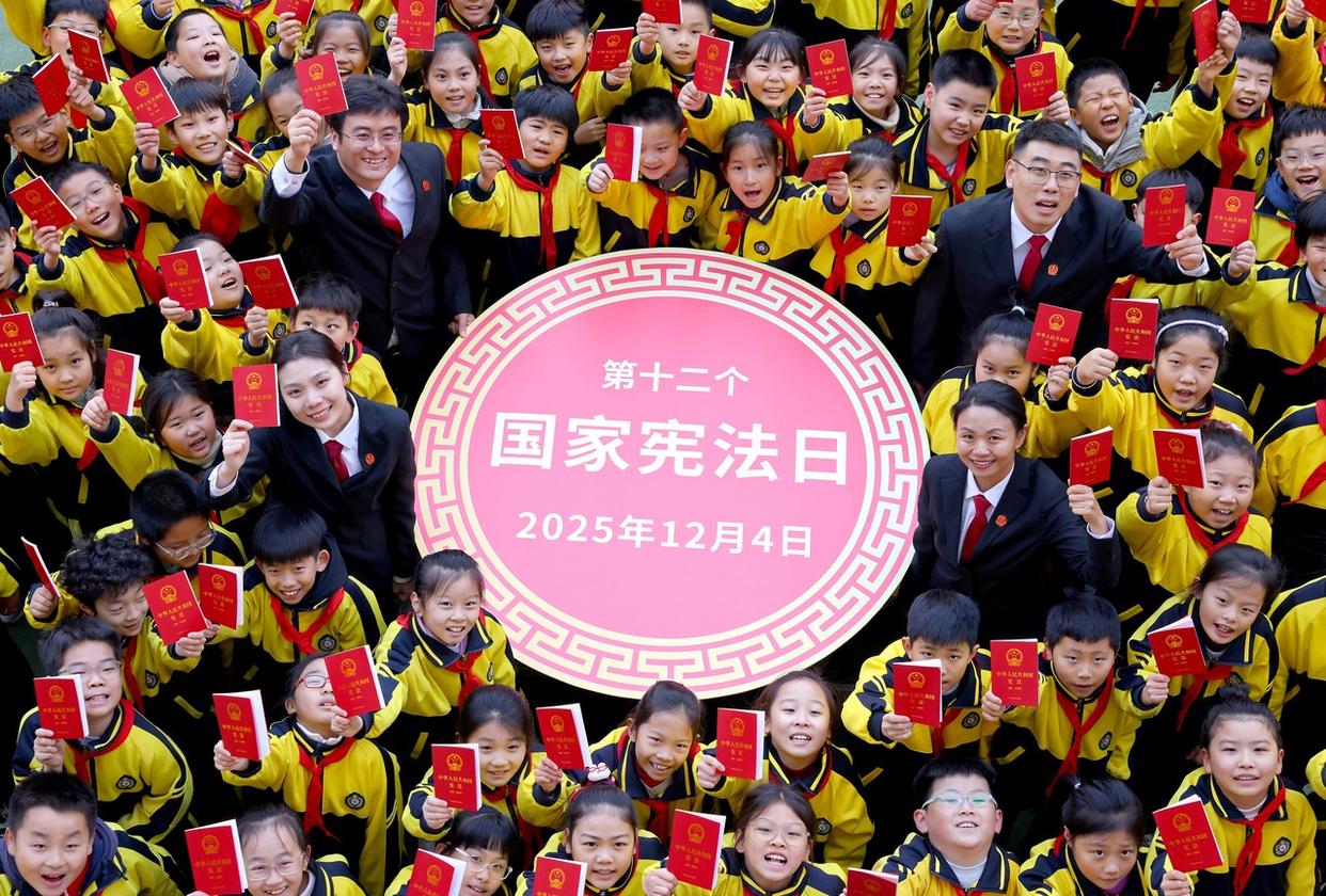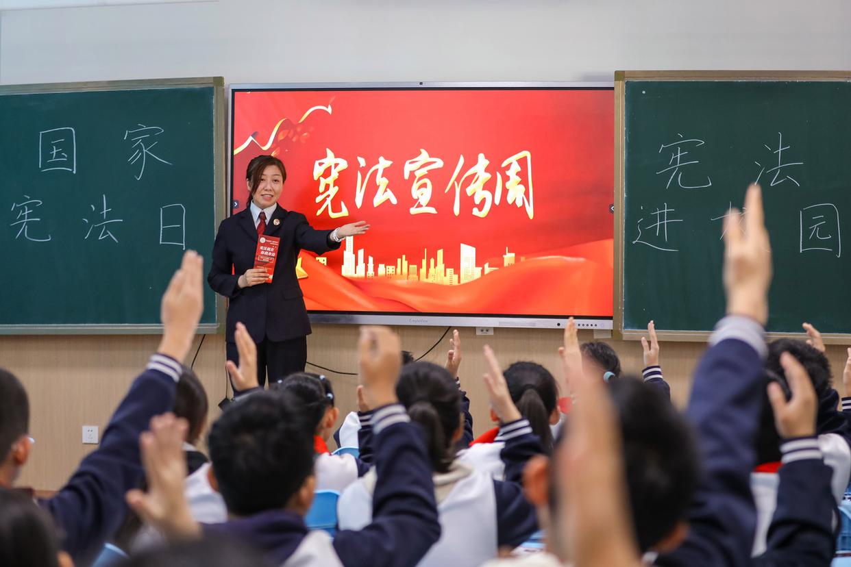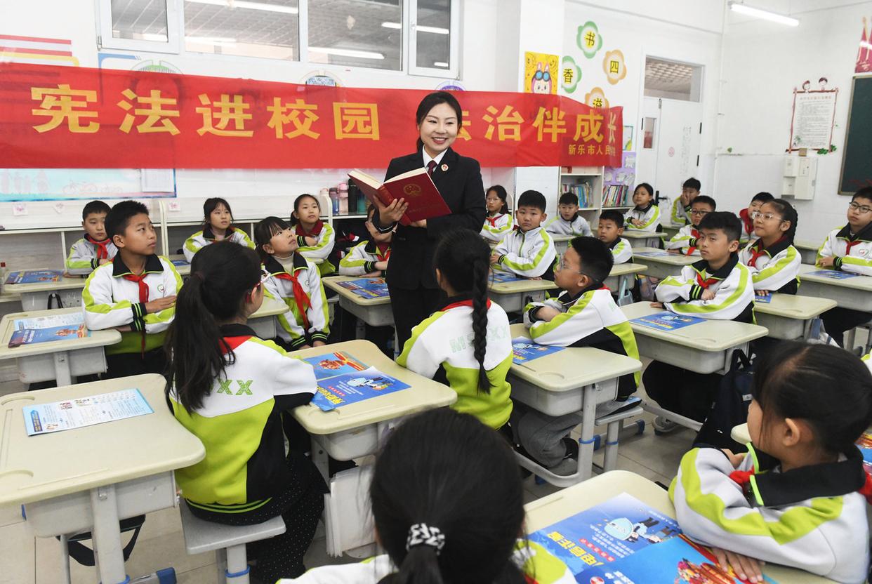 12月4日,在河北省石家庄市栾城区凌空桥路小学,栾城区法院的工作人员为学生们普及宪法知识。(工人日报通讯员 李明发 摄)