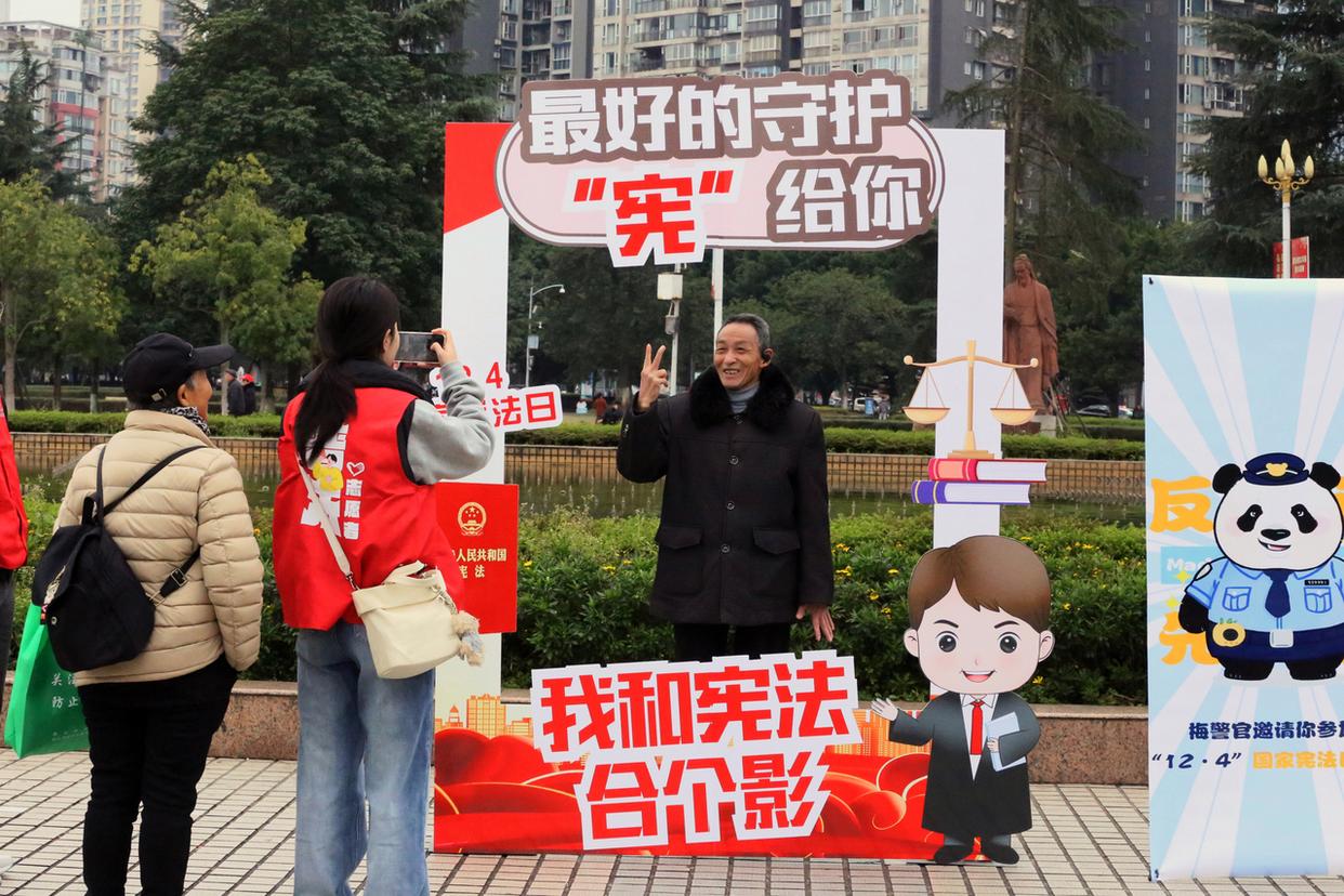 12月4日,四川省乐山市市中区司法局普法宣传志愿者在乐山新广场开展“宪法宣传日”活动,市民在法治打卡框合影留念。(工人日报通讯员 李华时 摄)