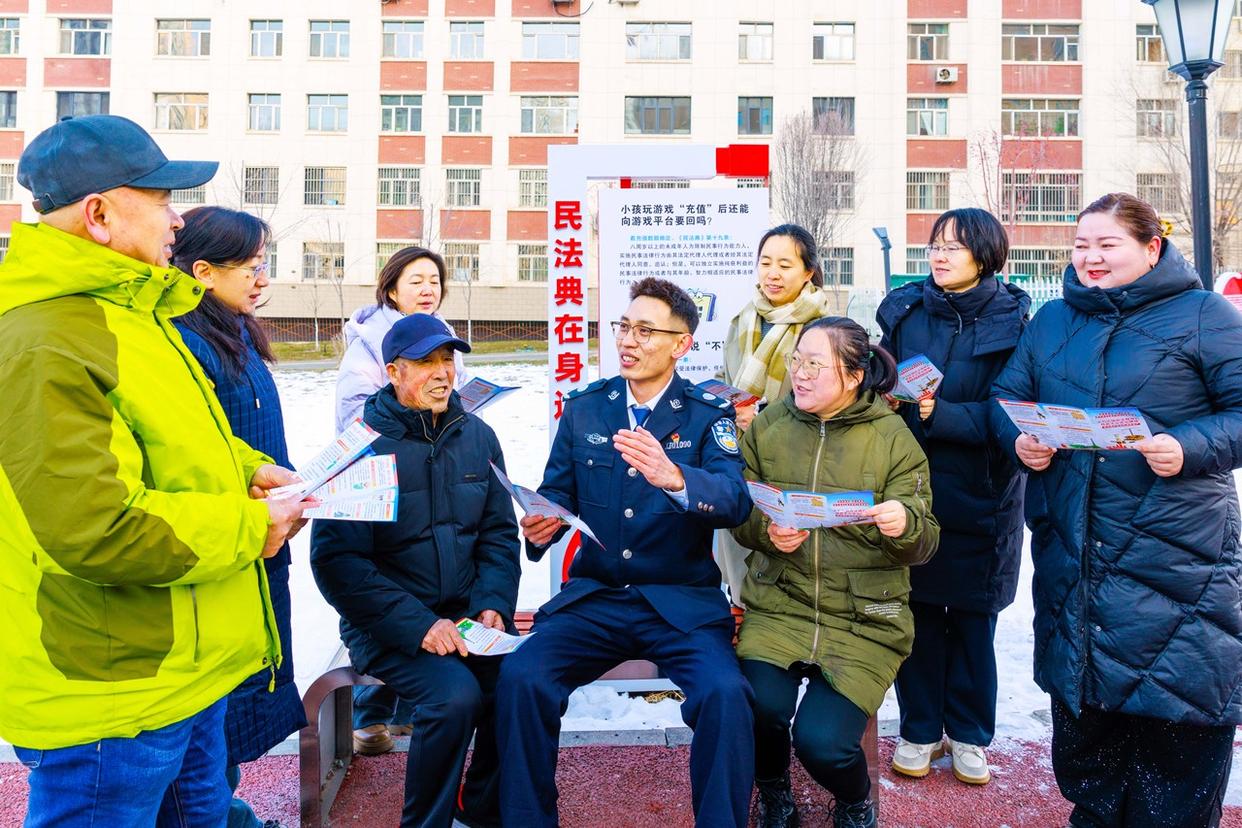12月2日,安徽省马鞍山市含山县公安局林头派出所联合镇司法所,将“法治课堂”搬进菜市场门口,向过往群众讲解《中华人民共和国宪法》《中华人民共和国民法典》等法律法规。(工人日报通讯员 冯善军 摄)