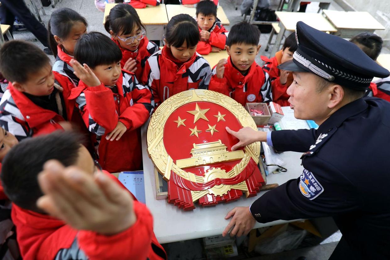 12月3日,安徽省马鞍山市雨山区雨山实验学校,司法干警给学生解读宪法核心内容。(工人日报通讯员 欧宗涛 摄)