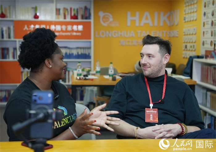 尼日利亚籍创业者马尔维斯·乌福马杜(左一)接受人民网外专柯明可采访。人民网记者 符武平摄